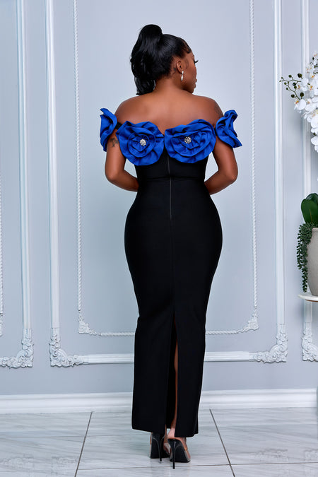 3D SCULPTED FLORAL APPLIQUE BANDAGE DRESS (BLACK/ROYAL BLUE)