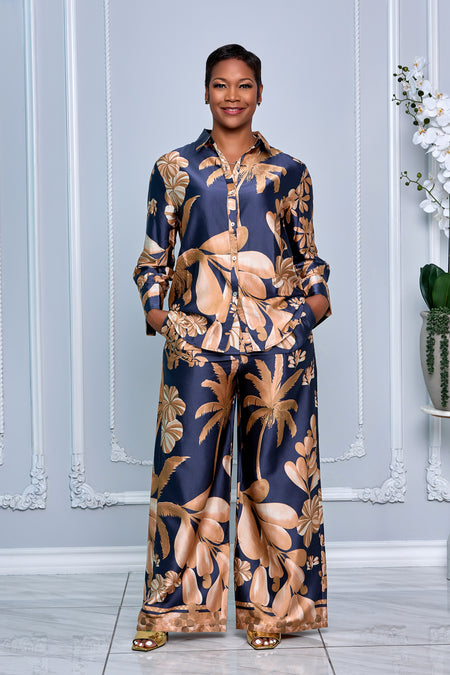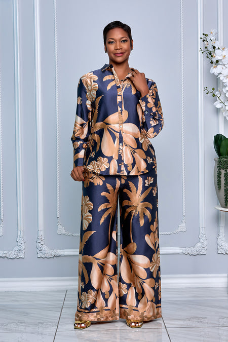 LONG SLEEVE BUTTON DOWN SHIRT TOP & WIDE-LEG PANTS SET (NAVY BLACK MULTI)