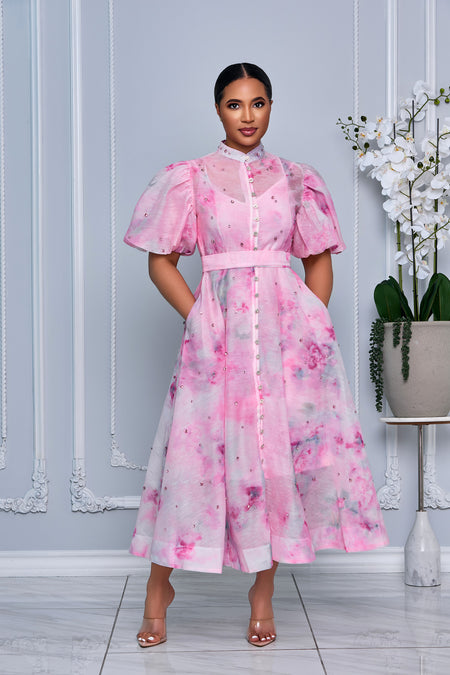 PINK RHINESTONE EMBELLISHED BUTTON DOWN A-LINE DRESS (PINK MULTI)