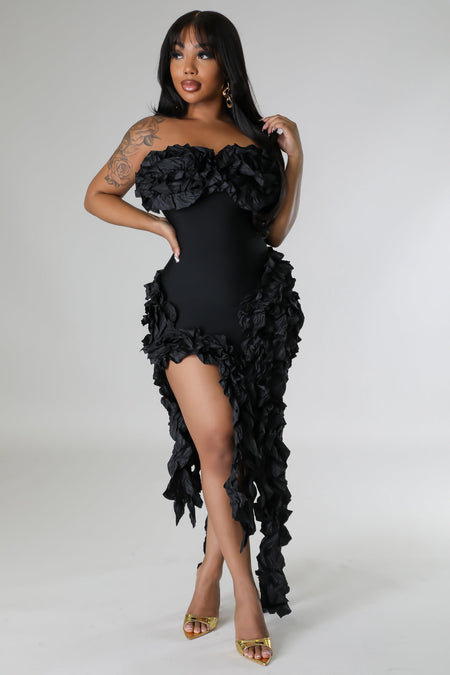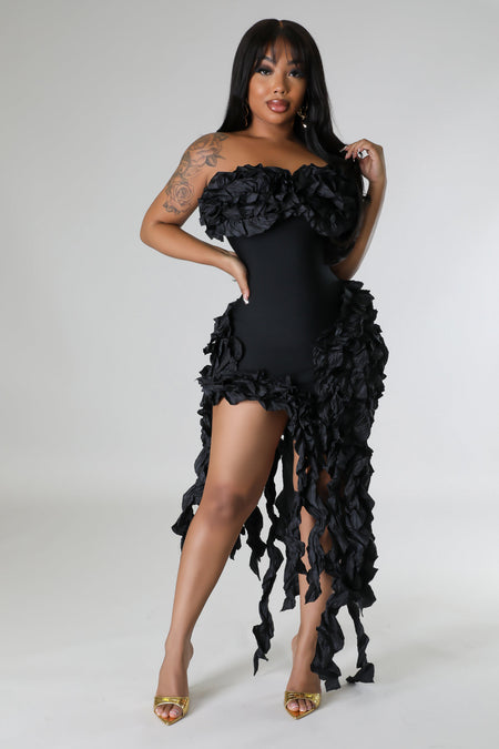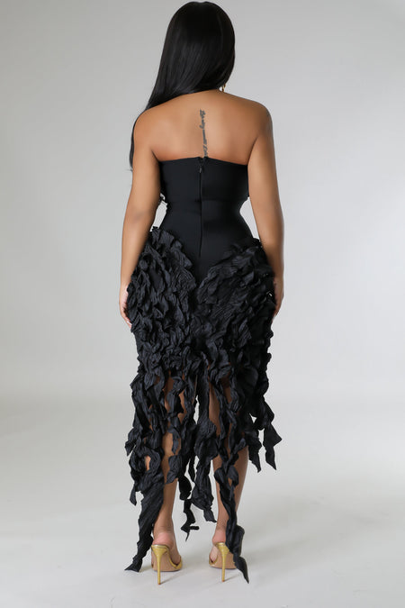 STRAPLESS RUFFLE ACCENT BANDAGE DRESS (BLACK)
