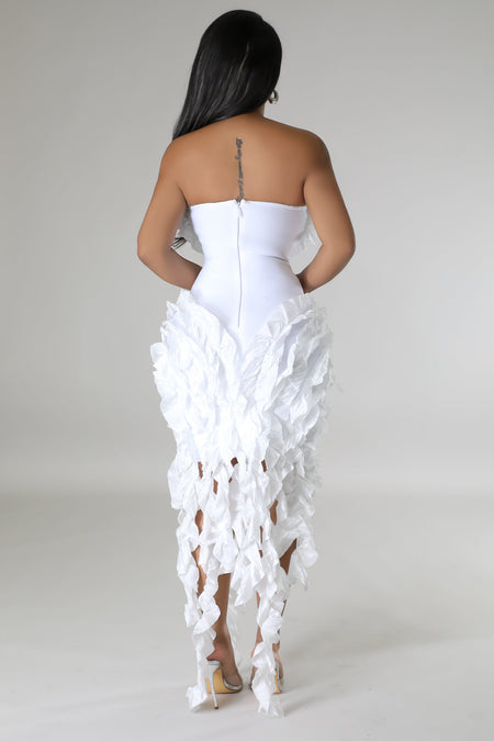 STRAPLESS RUFFLE ACCENT BANDAGE DRESS (WHITE)